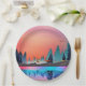 Teller aus Papier mit einem schönen grafischen Design mit einem friedlichen See mit Reh. und hohen Kiefern, die sich im Wasser widerspiegeln. Sterne schweben über.