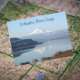 Travel Postcard mit dem Foto-Bild eines landschaftlichen Ausblicks auf schneebedeckte Berghütte, Oregon und ihre Reflexion im Columbia River. Wählen Sie aus einer matten oder glänzenden Stilkarte.