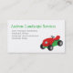 Eine Visitenkarte mit einem roten Mähtraktor für die Landschaftsbauer, wie Rasenmähen, Pflege, Unkraut, Dünger, Schädlinge, Kontrolle, Landschaftspflege, Landschaftsgestaltung und Gartenarbeit. Personalisieren Sie einfach Ihre Geschäftsdetails.