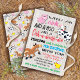 Super niedliche Landtiere mit lustigen funky Schriftart Geburtstagsfeier Einladung. Ideal für einen Jungen oder ein Mädchen! Ein Schweine-, Kuh-, Pferd- und Babyhühnchen auf einem holzgetreiften Hintergrund. Handgezeichnete Abbildung von McBooboos