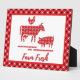 Auf dem Tafelschild des Landhauses stehen Silhouetten von Nutztieren (Kuh, Huhn, Schwein) mit rotem Bandanmuster gefüllt