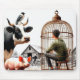 Dieses Mousepad hat Nutztiere, die eine Person in einem Käfig sehen, der darauf abgebildet ist.
