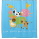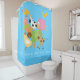 Duschvorhang mit albernen Nutztieren, einschließlich Hühner, Schwein, Kuh, Ziegen, Schafe und eine Ente mit Text, der Oink Quack Baa Moo Cluck!