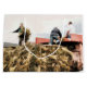 Ein Kunstdesign von Bauern, die auf einer Vintagen Dreschmaschine beschäftigt sind.