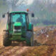 Vorbereitung auf die nächste Ernte. Der Traktor pflügt (pflügt) das Feld, und Wildvögel suchen nach Nahrung im frisch gedrehten Boden. Watercolor England.com.
