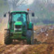 Vorbereitung auf die nächste Ernte. Der Traktor pflügt (pflügt) das Feld, und Wildvögel suchen nach Nahrung im frisch gedrehten Boden. Watercolor England.