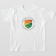 Das runde Logo auf diesem Anhänger mit weniger langen Ärmeln auf dem T - Shirt rocken