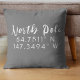 Saisonale Wurfkissen mit Längen- und Breitengraden des Nordpols. Weißer Schriftart auf grauem Hintergrund