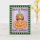 Senden Sie Halloween-Grüße mit dieser Karte eines niedlichen Dackelwelpen in einer lächelnden Kürbislaterne. Groß für Kinder alles Alters das Liebe langhaarige Dackeln und Halloween. Haben Sie ein glückliches Heulen-oween!