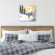 Ein Skilangläufer bewegt sich auf einem schneebedeckten Weg, umgeben von hohen immergrünen Bäumen und einem lebhaften Sonnenuntergang, der Himmel ist in Orange und Blau getönt