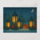 Eine gemütliche Winternacht: Laternen leuchten im Schnee, ein Fuchs, der von der Wärme aufgewühlt und heilig verstreut unter einem Sternenhimmel.