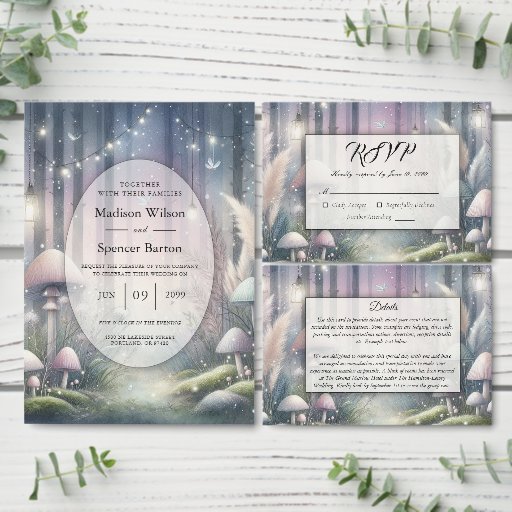 Mit diesem traumhaften Hochzeitsinklusivdesign laden Sie Ihre Gäste in einen zauberhaften Abend unter glänzenden Laternen ein. Set in einem pastellfarbenen Wald, der von sanft beleuchteten Pilzen, flatternden Schmetterlingen und funkelnden Lichtern beherrscht wird, ist diese bezaubernde Szene perfekt für ein romantisches Fest voller Staunen. Die sanften Farbtöne von Blüte, Lavendel und sanftem aquamarin schaffen eine märchenhafte Atmosphäre für Ihren unvergesslichen Augenblick.