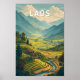 Laos retro vector travel design. From the UNESCO city of Luang Prabang and the spiritual charm of Vientiane to the natural beauty of Kuang Si Falls and the Plain of Jars, Laos offers an authentic blend of nature, history, and tranquility.