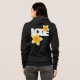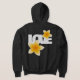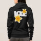 Black hoodie with white lettering hidden behind beautiful yellow frangipani blossoms.