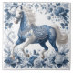 Ein Kiebitz, gefroren in einer mittelgroßen Pose, nimmt die zentrale Bühne auf dieser Keramik Kachel. Ein faszinierender Blumenteppich schmückt den Körper des Pferdes, fließende Mähne und Schwanz, der sich bis zu seinem dekorativen Sattel oder seinem Schmuckstück erstreckt. Der Künstler fängt geschickt die mächtigen Muskeln und die anmutige Bewegung des Tieres ein. Ein Rahmen von detaillierten Blumendesigns in derselben tiefblauen Farbe umrahmt die Komposition. Die symmetrische Anordnung und eine leicht erhöhte Perspektive unterstreichen die dynamische Haltung des Pferdes. Geräumige Farben und konsistente Beleuchtung schaffen eine Vintage und ruhige Atmosphäre, die an klassische Fliesenkunst erinnert. Dieses sorgfältig gestaltete Design verkörpert klassische Schönheit und Kunst.