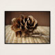 Diese Kunsthandwerkskarte zeichnet sich durch eine sehr einfache Stillleben-Komposition eines goldbraunen Lärchenkonus aus, der noch an seinem Zweig auf einer Strohmatte mit schokoladenbraunem Hintergrund befestigt ist. Das exquisite Detail dieses kleinen Kegels erinnert an eine hölzerne Rose. Lieblich zu Weihnachten und in der Ferienzeit.
