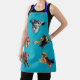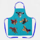 An apron featuring five large dog suoerheroes in flight. Clockwise they are Malamute, Bernese Mountain Dog, Golden Retriever, Bloodhound, and German Shepherd,