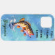 This phone case cover is just perfect for the avid fisherman! It has a vintage looking illustration of a Large Mouth Bass splashing up out of the water, and you can personalize it with the name of your favorite fisherman. Background is light blue with lots of bubbles floating up. This is a gift that Dad, Grandpa, your brother or best friend would love.