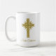 Shown is a lovely Christian large mug featuring a shining gold cross and personalized golden script text. This religious mug would make a wonderful gift for your favorite Christian, Catholic, CCD school or religious school teacher; nun, priest, pastor, spiritual friend or faithful relative. This personalized golden cross design can be ordered on a variety of mug styles and sizes, as well as on travel mugs and other gifts. The text is fully editable, including color, style, size, and placement, or it can be deleted. From Called. #TeacherGiftReligious #ReligiousMug #PersonalizedReligiousGift #LargeReligiousMug