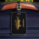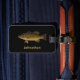 This is a double-sided luggage tag. Front: A largemouth bass is on a black background. A line of text is under the fish. You can edit the text to show your name.