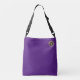 Crossbody Bag weiß mit lila, goldfarbenen und weißen konzentrischen Kreisen über einem lila und goldenen Rechteck mit "HOLLYWOOD, KALIFORNIA CENTER OF THE UNIIVERSE" "PFLANZEN SIE DAS PLANETEN UND ES WIRD AUF SIE ACHTEN". Wir alle müssen uns stärker bemühen, für unsere ERDE kümmern. Dieses Design ist ein Ausruf nach Hollywood, Kalifornien, der Hauptstadt des Films der Welt.