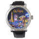 Las Vegas Strip-Lichter in der Nacht mit Verkehr in Bewegung und farbenfrohen Neonschildern sowie dem beleuchteten Eiffelturm. Der Text liest Las Vegas und ist vollständig anpassbar