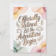 Feiern Sie einen wohlverdienten Ruhestand mit dieser eleganten Aquarell-Grußkarte mit dem handgeschriebenen Zitat „Offiziell im Ruhestand – Lass das Abenteuer beginnen.“