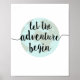 "Lass das Abenteuer an." Diese inspirierende Worte zum Leben, erinnert uns daran, uns auf das, was vor uns liegt, zu freuen und nicht auf die Vergangenheit zu leben. Handgeschriebener Kalligraphie-Text in klassischem Schwarz auf einer stilisierten Welt auf weißem Hintergrund funktioniert mit jedem Dekor, Schlafzimmer oder Kinderzimmer.