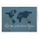 Lass dem Abenteuer Textdesign mit World Map Dekoration auf grunge, blauem Hintergrund