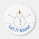 Dieser Magnet hat einen glücklichen Schneemann mit einer orangefarbenen Karottennase und ausgestreckten Armen, der auf den Schneefall mit blauem, gekrümmten Text hinaufschaut, der sagt: "Lass es schneien!"
