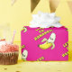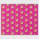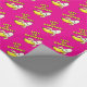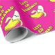 Adorable Packpapier, mit einem niedlichen Wiederholmuster eines Cartoon, kawaii Happy Gelb Banane mit dem süßesten Lächeln, große runde Augen und halb geschält. Oben in gelber Schrift mit einem schwarzen Schlagschatten, der "Lasse Go Bananen!" liest! Zwei hellgelbe Sterne sind beide Seiten der Worte. Der Hintergrund ist ein funky, hellrosa.