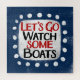 "Let's Go Watch Boats" ist ein niedliches Textdesign in marineblau mit schwarzem und rotem Text, zusammen mit einer weißen Akzent-Form und weißen texturierten weißen, weißlichen Punkten, die ihn umgeben.