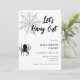 Diese moderne, schicke Schwarz-Weiß-Einladung enthält "lasst uns aushängen", geschrieben in Skripten und eine Spinne, die vom Netz hängt.