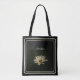 Die weißen Blütenblätter einer blühenden Blüte machen auf diesem schwarzen Totenbeutel einen auffallenden Eindruck. Ihr Name erscheint in lässiger femininer Typografie oberhalb der Blume. Zwei viereckige Konturen in hellgelb schaffen einen attraktiven Akzent an den Rändern der Tasche. Auf beiden Seiten erscheint das gleiche Blumenbild. Dieses botanische Design sieht auch bei größeren Taschen gut aus.