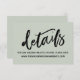 Behalt deinen Hochzeitsgästen in der Schleife mit all deinen Details mit diesen hübschen, modernen Hochzeitssteckkarten. Ein lässiges Texteüberlagern wurde mit einem lässigen handgeschriebenen Schriftart in Schwarz entworfen, der einfach "Details" liest. Verwenden Sie die Vorlagenfelder, um diese Gehäusekarten mit Ihren persönlichen Daten anzupassen. Die Hintergrundfarbe kann von Ihrer Hochzeitspalette auf alles geändert werden, was Sie auswählen; der bearbeitbare Text erscheint in schwarz. // 100 //