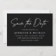 Einfache Save the Date Karte mit "Save the Date" in einem weißen handgeschriebenen Skript mit schwarzem Hintergrund. Personalisieren Sie die moderne Save the Date-Karte, indem Sie Ihre Namen, das Hochzeitsdatum, den Hochzeitsort, die Hochzeitswebsite, etc. hinzufügen. Die minimalistisch Save the Date Karte kehrt um, um einen soliden schwarzen Hintergrund mit Platz für zusätzlichen Text und Fotos anzuzeigen.