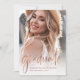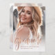 Diese trendige, elegante Party Einladung verfügt über zwei Fotos des 2022 Absolventen. Auf der Vorderseite gibt es lässige moderne Imitate Rose Gold Look Skript zusammen mit dem Namen, Schule, und Klasse Jahr. Auf der Rückseite ist ein zweites, verblasstes Foto des Absolventen mit all Ihren Party-Informationen deutlich auf einem Overlay gedruckt. Eine stilvolle und einfache Abschluss-Einladung, die die beliebtesten persönlichen Fotos Ihres Abschlusses hervorheben wird!