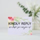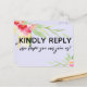 Beide Seiten dieser hübschen Karte wurden mit Sprays von bunten Aquarellfarben-Blume geschmückt. In bearbeitbarem Text wurde "freundlich antworten", groß und fett, auf der Vorderseite platziert. In einer modernen lässigen Handschrift erscheint unten eine Grafik mit dem Bild "Wir hoffen, dass du dich uns anschließen kannst!". Auf der Rückseite wurde derselbe einzigartige Schriftart verwendet, um Grafiken zu erstellen, die "uAwg", "m" und "freundlich zu liefern" lauten und alle anderen Texte editierbar sind. Verwenden Sie die Vorlagenfelder, um so viel zu personalisieren, wie Sie möchten. Der Hintergrund kann in eine beliebige Farbe geändert werden. // 100 //
