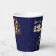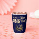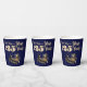 Glamouröse Party-Papiertassen zum Feiern von Jahresende und Jahresanfang, auf blauem Hintergrund, mit goldenen und schwarzen Details, leicht anpassbar