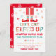 Lasst uns das Pajama-Weihnachtsferien-Party aufgeben. Elfbeine in Schlafanzug, handgezeichnete Schriftart und Schneeflocken in Aqua-, Rot- und Pfirsichfarben. Schwarz oder Weiß