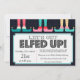 Schöne Ivory & Light Blue Background Feierlichkeiten Einladung Features. "Let's Get Elfed Up" erscheint oben in schwarz. Passen Sie sich mit Ihrem persönlichen Gruß, Familiennamen und individuellen Namen an.
