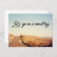 Ein originelles Foto der offenen Straße in der Wüste, mit den inspirierenden Worten "Lass uns auf eine Reise gehen" in schöner handgeschriebener Kursiv mit einem Pinselstift. Eine perfekte Postkarte für diejenigen, die Liebe Abenteuer und Reisen.