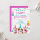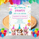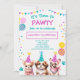 Adorable Girls "lasse pawty" niedliche Welpen Geburtstagseinladungen. Die Farbtöne sind lebendig mit aquamarinen, pinken und farbenfrohen Ballons.