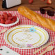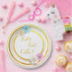Lasst uns Pink und Blauer Teller mit Blumenpapier