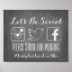 Lasst uns Social Wedding Hashtag Sign auf Chalkboard Hintergrund. Helfen Sie mit diesem Hashtag-Zeichen, Fotos von allen Ihren Gästen an Ihrem großen Tag zu erfassen. Sie können die Größe dieses Schildes ändern und es sieht so aus, wie es ist oder gerahmt. Der gesamte Text ist vollständig anpassbar und kann für jeden Anlass verwendet werden.