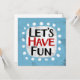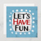 "Let's Have Fun" ist ein niedliches Textdesign in hellblau mit schwarzem und rotem Text, zusammen mit einer weißen Akzent-Form und weißen texturierten weißen, weißgetönten weißen Punkten, die ihn umgeben.