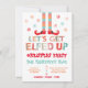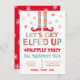 Lasst uns die Weihnachtsfeier aufgeben. Elfbeine, handgezeichnete Schriftart und Schneeflocken in Aqua-, Rot- und Pfirsichfarben.