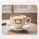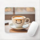 Latte Tasse mit einem Lächeln und cremigem Herz durch ein sonniges Fenster.