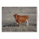 Foto einer Langhornkuh, die im trockenen Gras stehend und ihre Nase leckt.