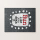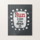 Ein niedliches typografisches Design, das "Run like you Gemein It" sagt. Es ist mit schwarzem und rotem Text auf einem weißen Rechteck mit funky, spielerisch weißen Punkten umgeben, die alle auf einem grauen Hintergrund liegen.